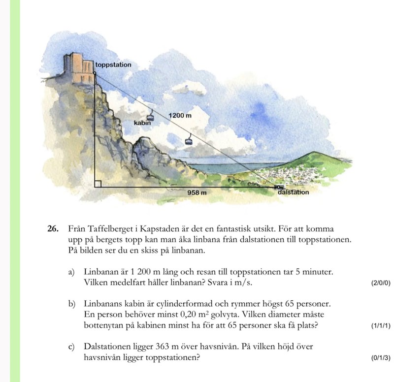C-uppgiften: Använd Pythagoras sats för att beräkna längden av den vertikala sidan i bildens rätvinkliga triangel. Detta är lika med höjdskillnaden mellan dalstationen och toppstationen.