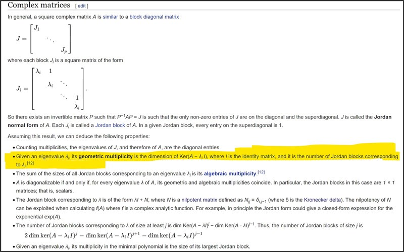 är lika med antalet vanliga egenvektorer och det är lika med antalet 1x1 jordanblock, inte lika med antalet jordanblock.