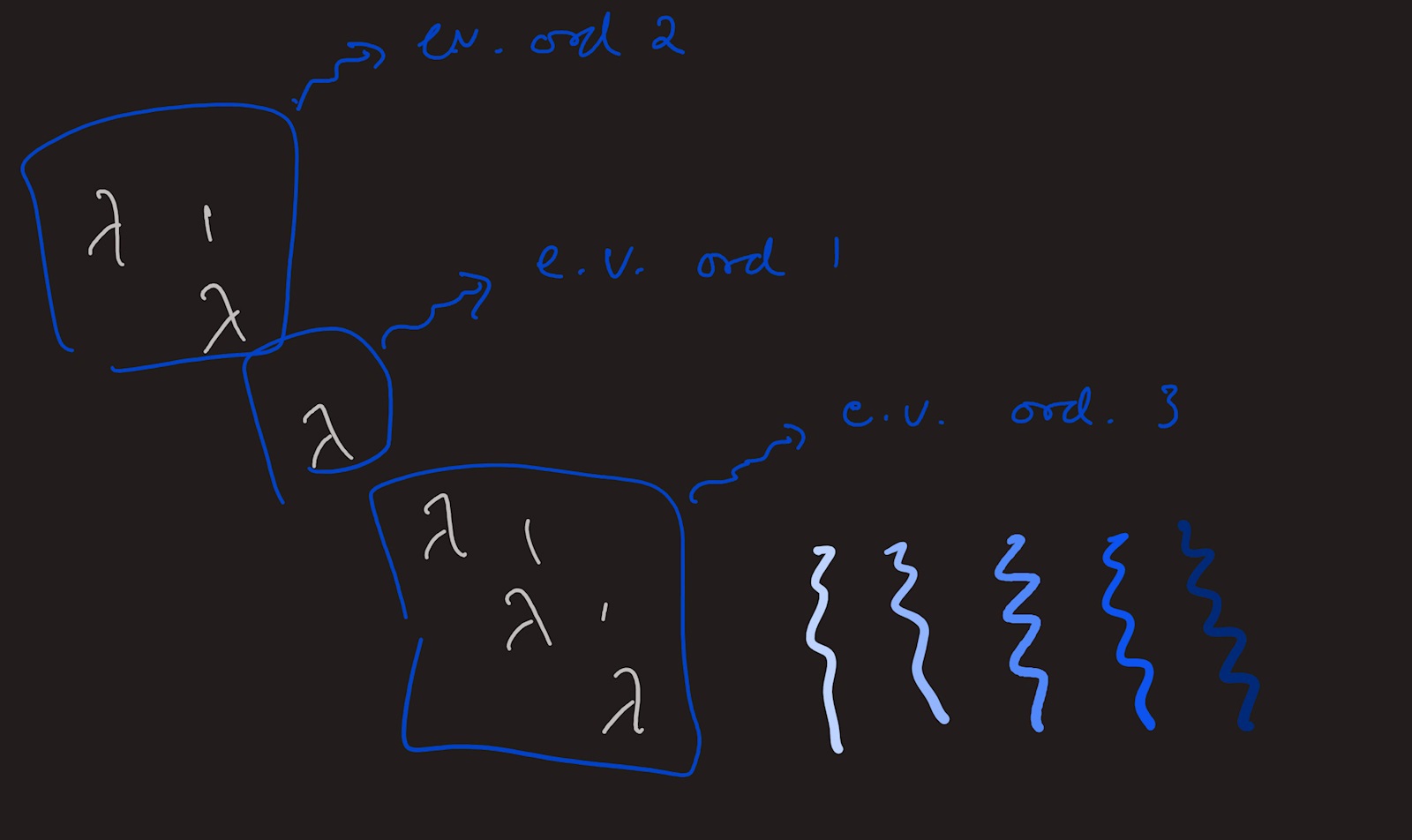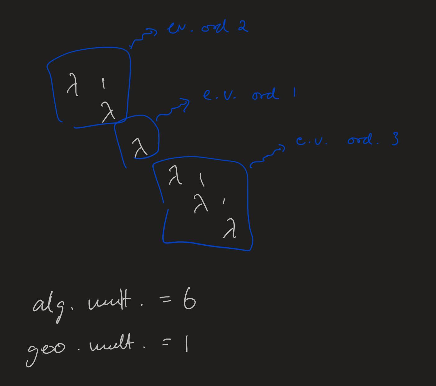 Det finns egenvektorer av ordning 1 och 2 och 3, en vardera. Den geometriska multipliciteten är 1 men antalet jordanblock är 3?