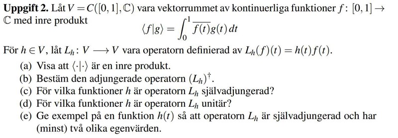 Angående (d), för det första måste h vara nollskild, sedan: $$L_h^{-1}=L_^{\dagger}$$ vilket betyder att , så . Men kan h cirkulera på enhetscirkeln mer än ett varv? Det borde en väl kunna?