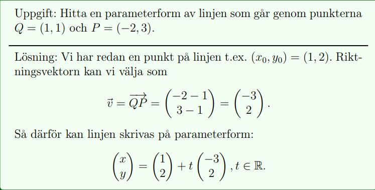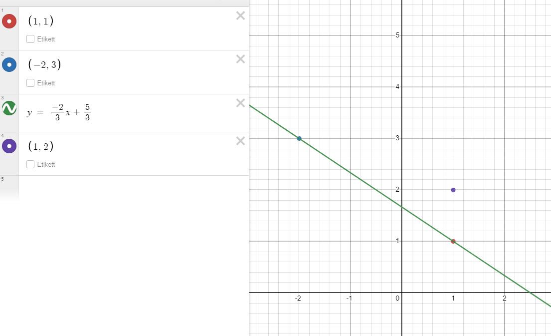 Hej. Bifogat en bild på en uppgift från linjär algebra och geometri 1. Hur kan (1, 2) vara en punkt på linjen? Om jag ritar upp en linje som går genom punkterna (1, 1) och (-2, 3) så går linjen klart och tydligt inte genom punkten (1, 2). Är det något jag har missat eller har författaren skrivit fel? Tack
