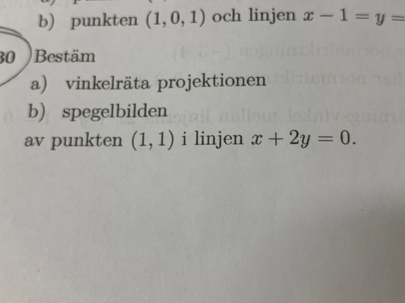 EDIT: Den här uppgiften kan man lösa i kurs Ma2 (fast det skulle vara en svår uppgift) - det man behöver veta är hur man får fram lutningen för en rät linje som är vinkelrät mot en annan.) Ordet "vinkelrät projektion" måste i så fall förklaras i frågan, kanske "spegling" också, men matten räcker till.