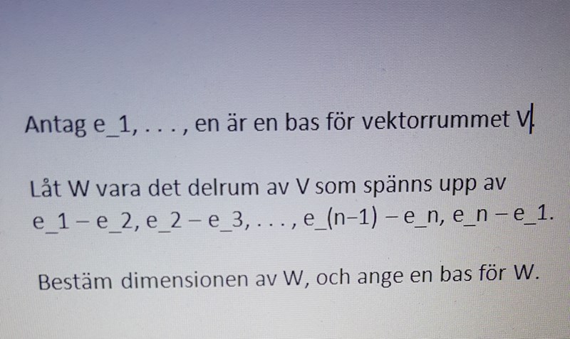 Def av bas: Vektorerna ska spänna upp V dvs här vara n st. Och de ska vara linjärt oberoende. Men vet inte hur jag ska testa det för vektor 0 till n liksom.