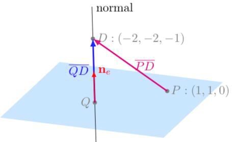 Vi rör oss i normalens riktning (3,1,2) från D till P