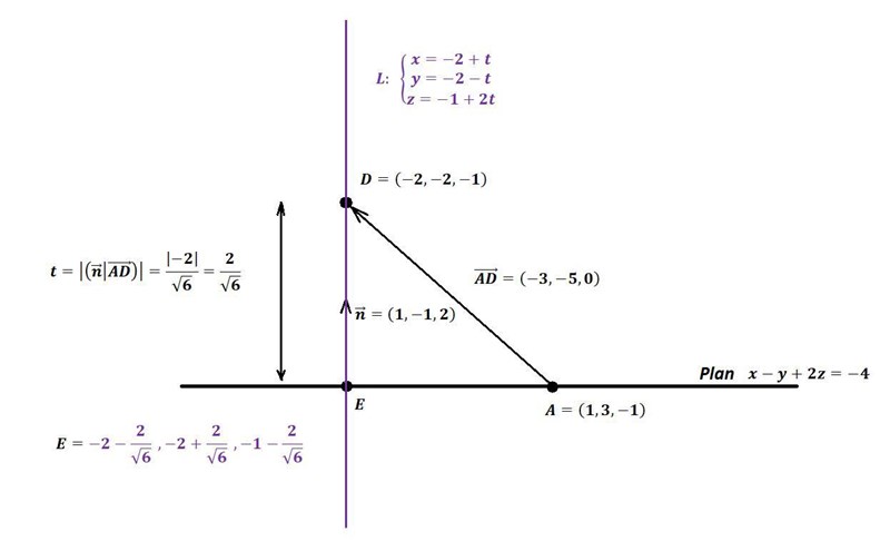 Insättning i planets ekvation (skärningspunkt normal-plan) ger att och den efterfrågade punkten Q (i min figur): , och efter kontroll:
