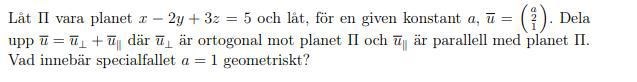 När du nu har planets normalvektor kan du räkna ut de två projektionerna av vektorn på samt på planet. Hur ser dessa projektioner ut?
