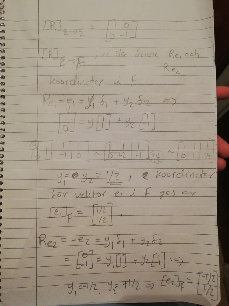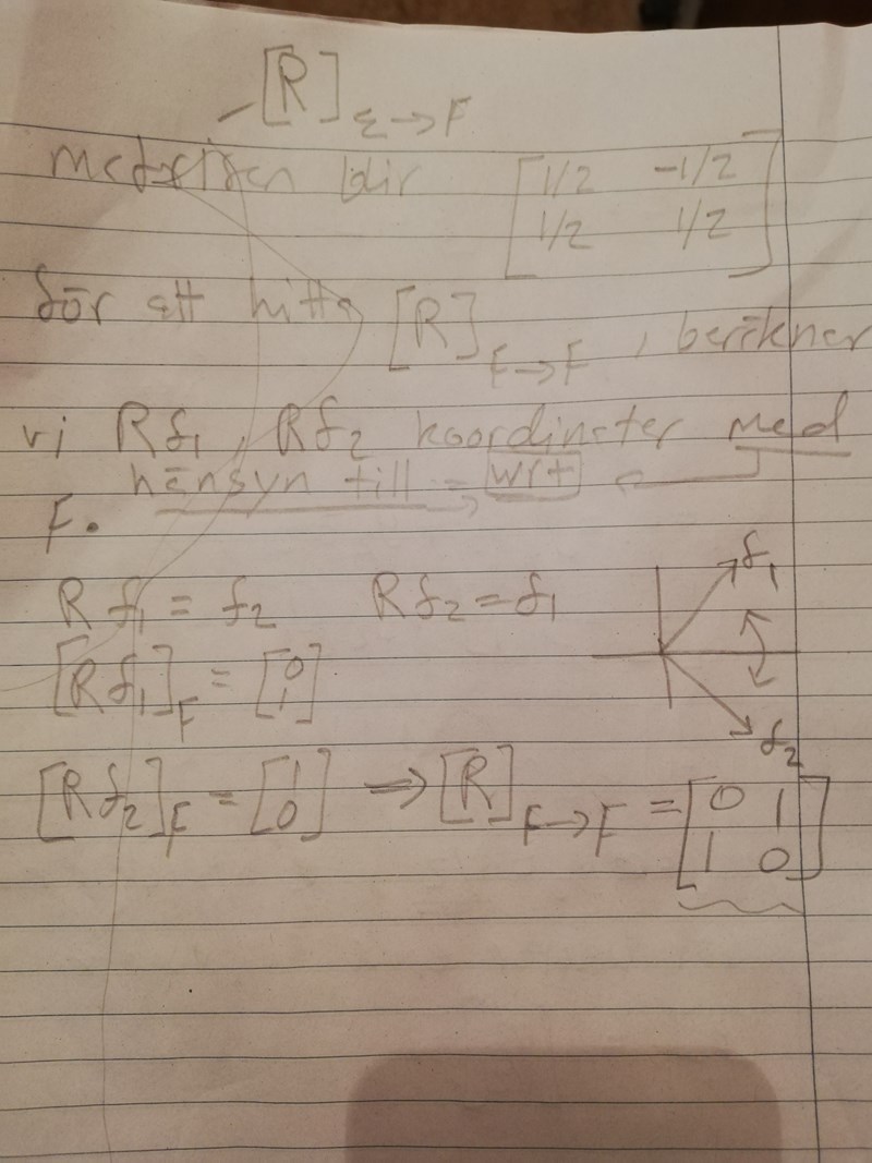 hej, jag undrar på, varför på den sista delen där vi ska finna [R]f--->f, är det standardbasvektorerna som blir transformerat och inte f=(1,1) och f2=(1,-1).