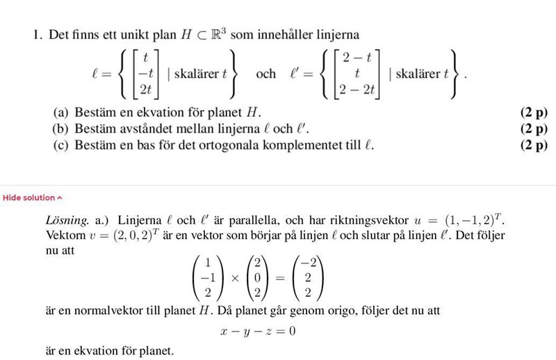 Varför blir normalvektorn till planet (-2, 2, 2)? Man borde väl få normalvektorn genom att kryssa riktningsvektorerna för de två linjerna?