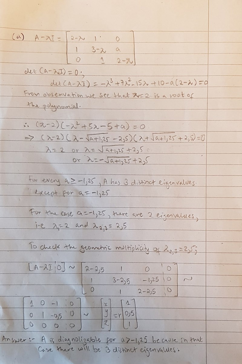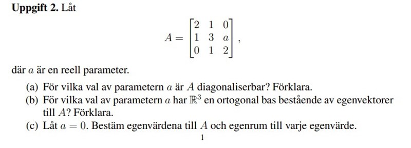 (a)När jag försöker lösa 'det(A-λI)=0' så får jag '-x³+7x²+ax-15x+10-2a=0'. Hur kan jag lösa den när jag har fler okända variabler?
