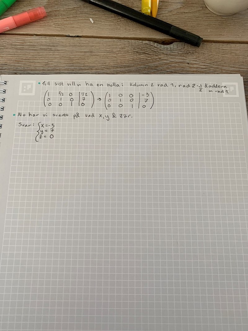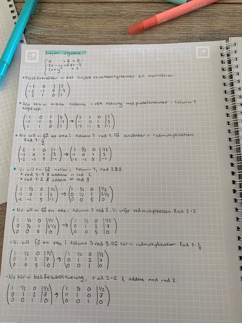 Jag ska lösa följande uppgift med Gausselimination. Jag vet inte riktigt om jag har gjort rätt. Jag får svaret x=-301/24, y=65/12 och z= -11/24. Jag tror att det är fel. Skulle jag kunna få lite hjälp