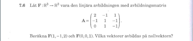 Alla vektorer parallella med vektorn (0,1,1)(0,1,1) avbildas således på (0,0,0)(0,0,0), dvs Av0Av\equiv 0v=t(0,1,1)v=t(0,1,1) för tt\in \mathbb{R}