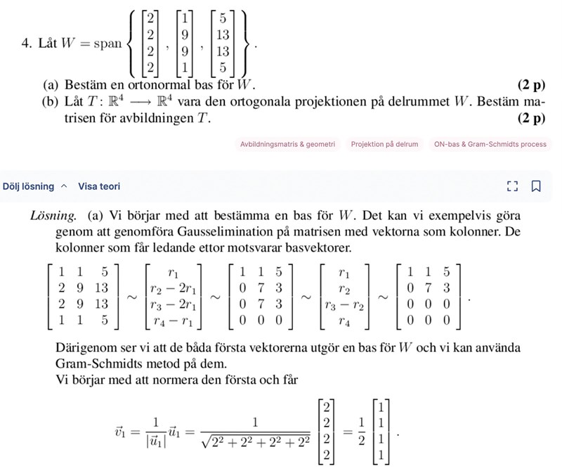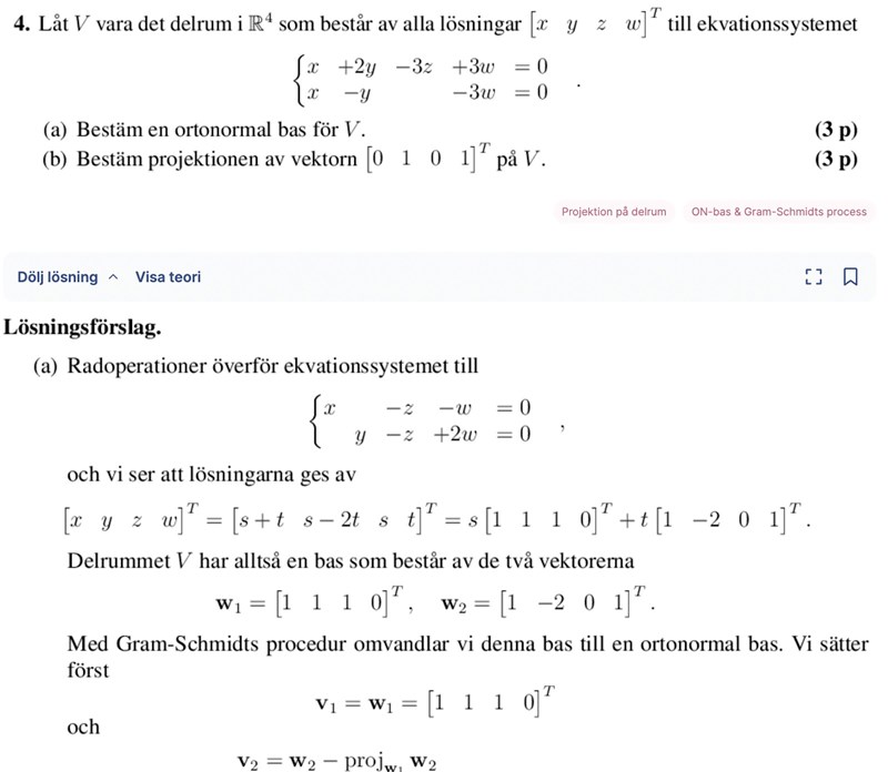 I sådana frågor, hur vet man om man ska lösa systemet och hitta lösningar och använda det som baser eller om man ska se vilka vektorer som utgör en bas för W? Liksom hur vet man ifall man ska lösa systemet och sedan använda dess lösningssystem som vektorer eller enbart kolla vilka som ger ledande ettor?