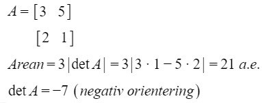 Om du har två vektorer u och v i R2 så ges arean av parallellogrammen som spänns upp av vektorerna av |det[u v]|.