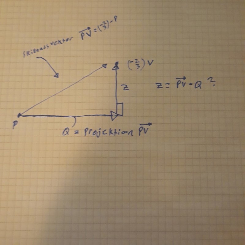 Nu kanske du tappar mig, så jag tänker så får vi en skillnadsvektor mellan vår godtyckliga punkt och punkten (-2,3). Och den skillnadsvektorn har formeln PV(Skillnads vektorn)= Z(vinkelräta avstånd)+Q(O-N Projektionen av skillnadsvektorn)