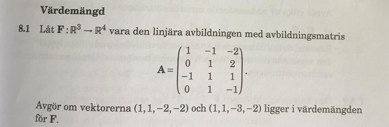 Linjär Algebra, Avgör om vektorerna ligger i värdemängden. (J.Månsson 8.1)