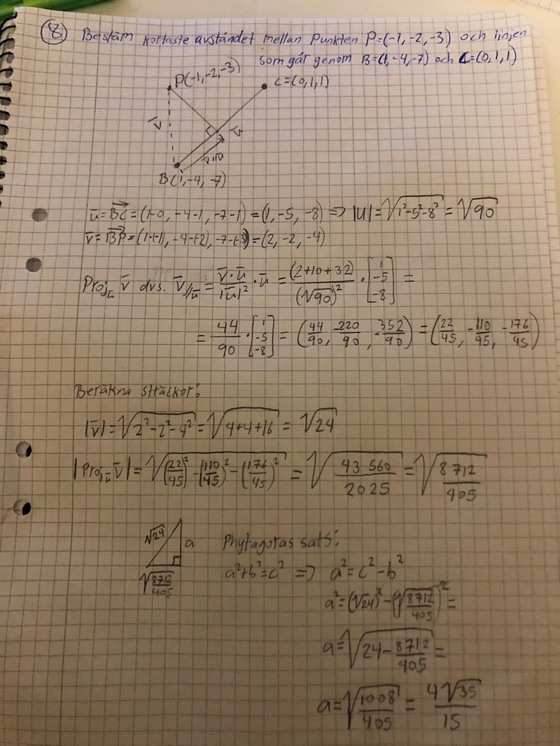 Bestäm (kortaste) avståndet mellan punkten P=(−2,−1,3) och linjen genom punkterna B=(1,3,−6) och C=(0,1,−2).