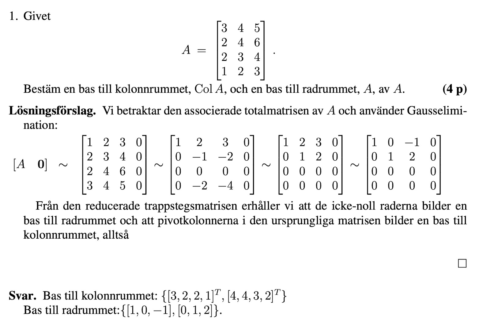 Observera att om du gör radoperationer på en matris så kommer du vanligen att förändra kolonnrummet, så kolonnerna i den radreducerade matrisen spänner vanligen inte upp kolonnrummet till ursprungsmatrisen A. Dock är det så att de kolonner i A som motsvarar kolonnerna med ledande ettor i den radreducerade matrisen utgör en bas för kolonnrummet till A. Se D4NIELs kommentar i #3.