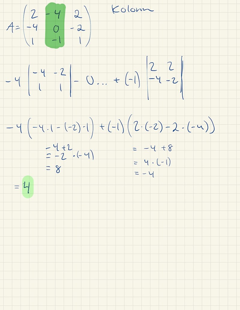 Japp har gjort det, problemet kanske ligger i att när jag gör "kolonn utvecklingen" så får jag svar 4 medans i facit står det endast ett rätt svar (detA=-4 vilket jag får för rad utvecklingen och antar då att kolonn också skall vara -4).