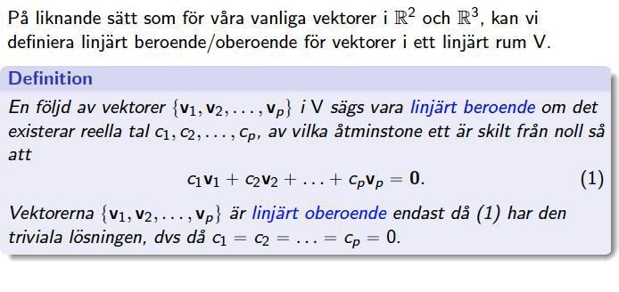 parveln skrev:gurkan1 skrev:Rätta mig om jag har fel nu, men visst är det så att en vektor är linjärt beroende om summan av samtliga vektorer är lika med nollvektorn, och dessa är då i samma plan.