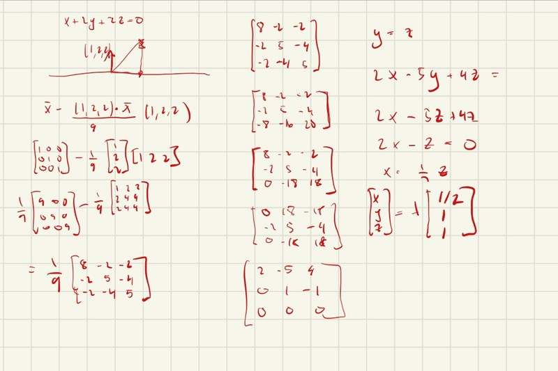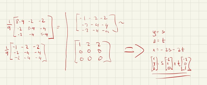 D4NIEL skrev:Planets normal är i standardbasen så egenvektorn till egenvärdet 0 måste vara parallell med den vektorn.