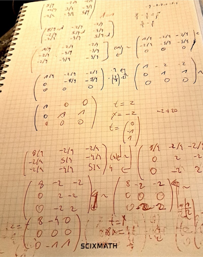 Jag får (0,-1,1) med egenvärde 1 och (1/2,1,0) med egenvärde 0. Hat räknat med 1/9 hela tiden i gausning så jag fattar ej varför jag ej får som er.