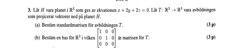 PATENTERAMERA skrev:Matrisen i b) är diagonal, så du bör bestämma en bas som består av egenvektorer till T. De två första egenvektorerna skall motsvara egenvärdet 1 och den sista egenvärdet 0. Tänk lite på vad för slags avbildning T är?