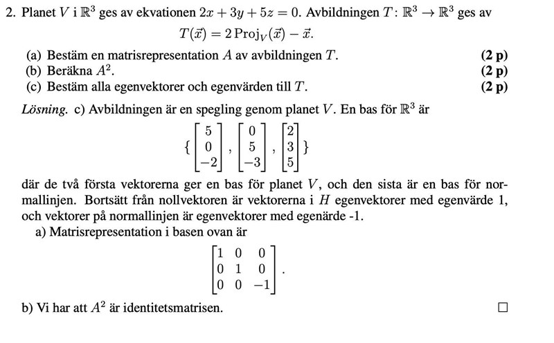 Förstår inte riktigt a uppgiften här. Hur kommer de fram till matrisrepresentationen som de gör? Min första tanke var att man skulle bestämma matrisen genom att sätta dess kolumner till T(ex), T(ey), T(ez), där e är respektive kolumn i identitetsmatrisen men detta blir inte samma som svaret som ges i a ovan
