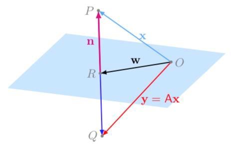 är ortogonala projektionen av x på normalen QP. Enligt projektionssatsen gäller