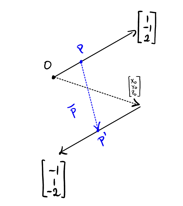 P och p’ som i bilden funkar. Specifikt borde kunna ta vektor från origo till (2,0,2). Denna är ju inte paralell med riktningsvektorerna.