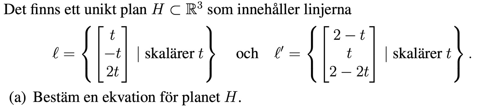 Vet inte om jag har rätt approach, men jag tänkte först att man kunde bestämma riktningsvektorerna för linjerna och sedan använda kryssprodukt på dessa för att få normalvektorn och sedan på så vis få planets ekvation på normalform. På vägen upptäckte jag däremot att dessa linjer är parallella, och jag tänkte då att man istället kan få fram en annan riktningsvektor för en annan linje men vet inte hur.