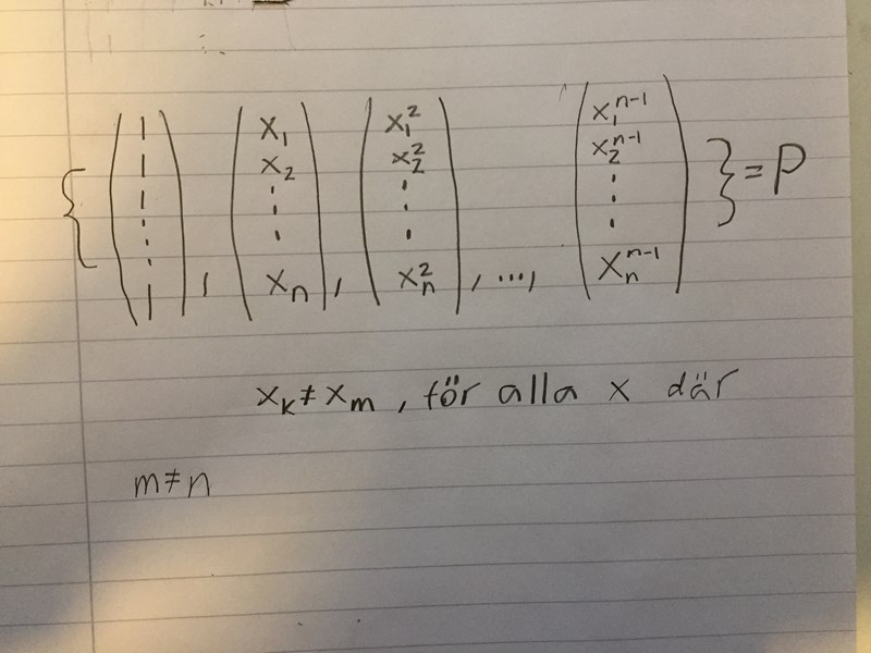 Nu har vi två polynomer av samma grad som måste vara = varandra. Per definition måste eftersom båda är koefficent till och på samma sätt måste då de båda är koefficenter framför osv. Nu har vi vissat att den enda lösningen för v är den triviella alltså är A(=P) colum vektorer en bas för R^n