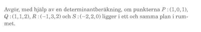 Hej! Vilken information är väsentlig för att lösa denna uppgift? Jag är medveten om att vektorerna som kan skapas utifrån givna punkter är linjärt oberoende om determinanten inte är noll. Men bara för att vektorerna är linjärt oberoende betyder det ju inte att punkterna befinner sig i samma plan. Vad har jag missat?