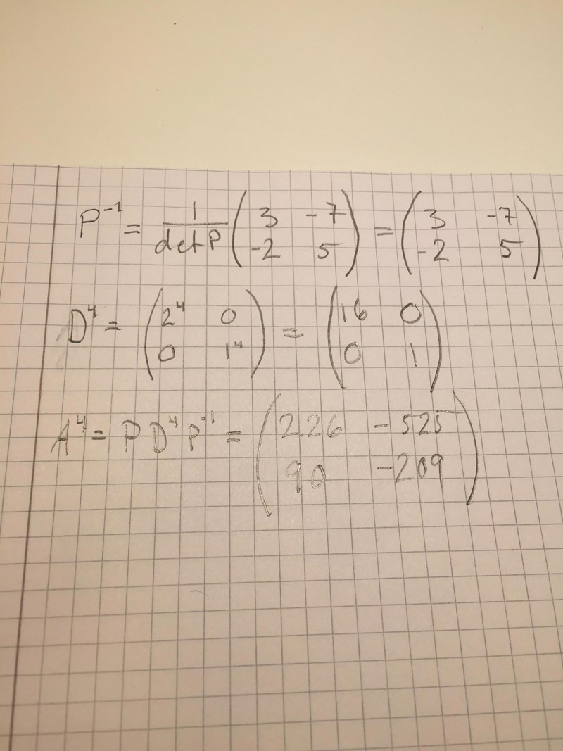 Jag får p ^-1 till samma och D4 till samma.. men sen får jag inte det svaret. Så jag måste ha räknat fel där? Matrismultiplikation när det är fler än två matriser verkar jag inte vet hur man gör.. Kan du visa?