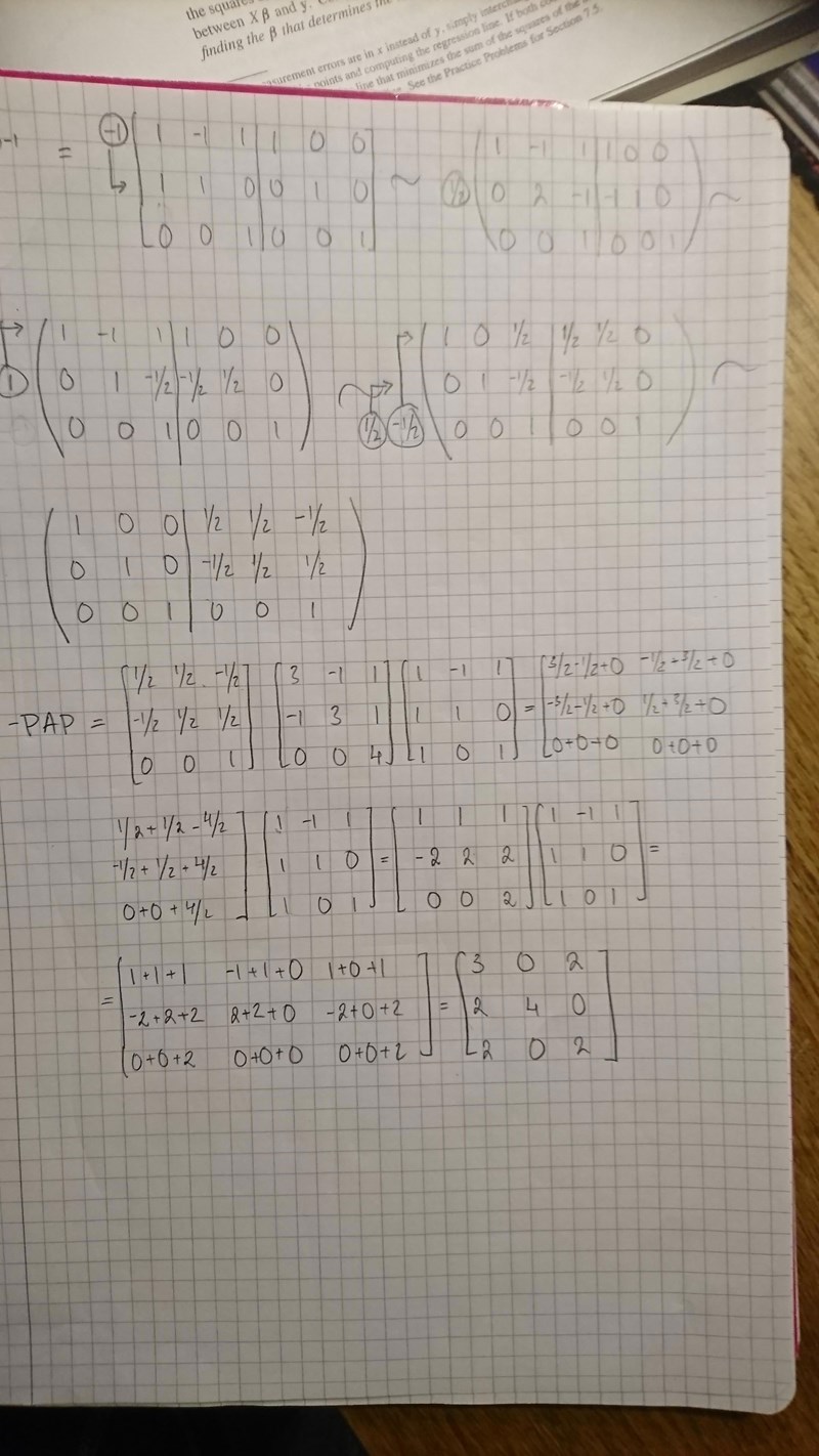 När du utfört matrismultiplikationen för att få elementen så verkar du ha gjort fel på platsen i rad 1 kolonn 3. Du får . du får 1.