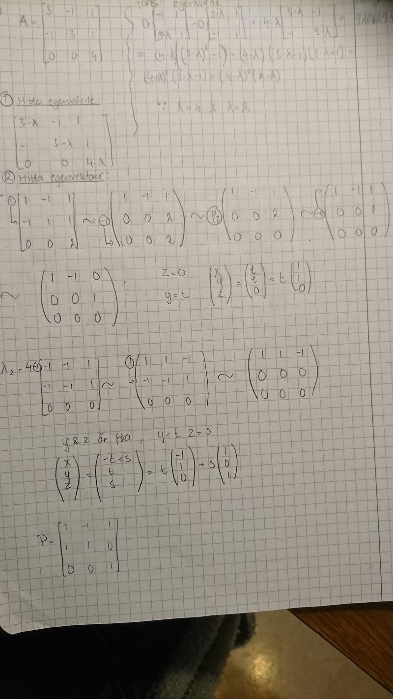 Nej alltså jag menar när man väl fått fram egenvärdet och sätter in det i matrisen och gör radoperationer. Då har jag för mig att minst en rad ska bli noll?