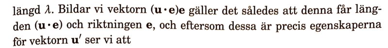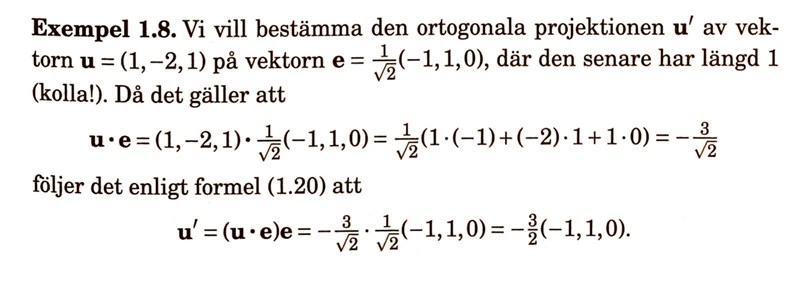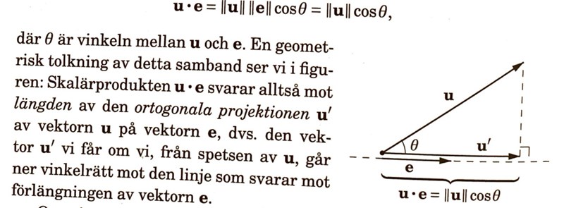 Utifrån denna paragraf verkar det som skalärprodukten av u och e ger längden, men tidigare i kapitlet nämner de att en skalär anger "bidraget" till en godtycklig vektor. Längden ges väl av ,