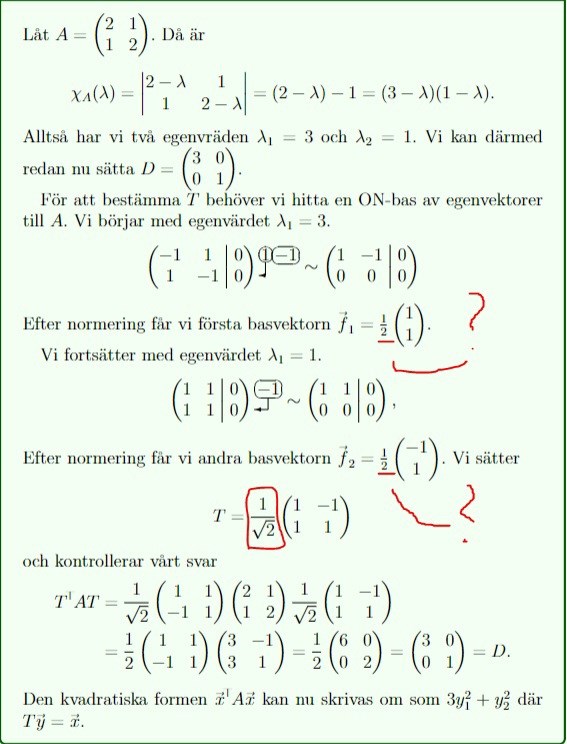 Hej. Jag har fastnat på detta exempel om kvadratiska former i linjär algebra. Jag har markerat med röd penna i bilden nedan det jag tror är fel. Längden på både (1 1) och (-1 1) är ju , eller hur? Tror ni att de har glömt roten ur-tecknet?