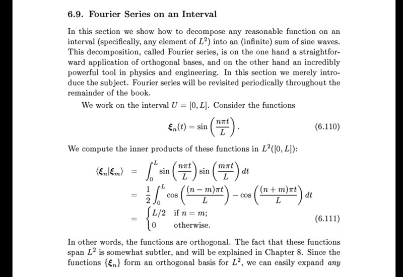 - är linjär algebra och fourieranalys intrinsically intertwined eller är det är ”bara ett intressant perspektiv” som här där man valt att ha med i en bok som annars handlar om linjär algebra för att visa på dess användbarhet? Det finns massor av nybörjarintroduktioner till ämnet men de säger ju inget om linjär algebra (även om det i alla fall enligt mig är rimligt att anta den förkunskapen). De utgår snarare från något verklighetsförankrat med ljud och ljus och så. Jag kan tänka mig att man kan lära sig en hel del om fourieranalys även om man undviker att nämna (eller snarare beskriva i termer av begrepp från) linjär algebra, eller kan man det?