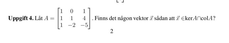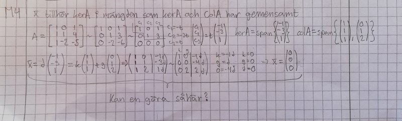Jag tänkte att vektorn x måste vara en version av basen till nollrummet och att denna vektor måste gå att skriva som en kombination av basvektorerna i bildrummet till A. Jag kom fram till rätt svar, men jag är väldigt osäker på det som jag gjorde på den sista raden (facit säger bara att x = (0, 0, 0) men inget mer). Kan någon förklara hur det är meningen att en ska lösa en sån här uppgift?