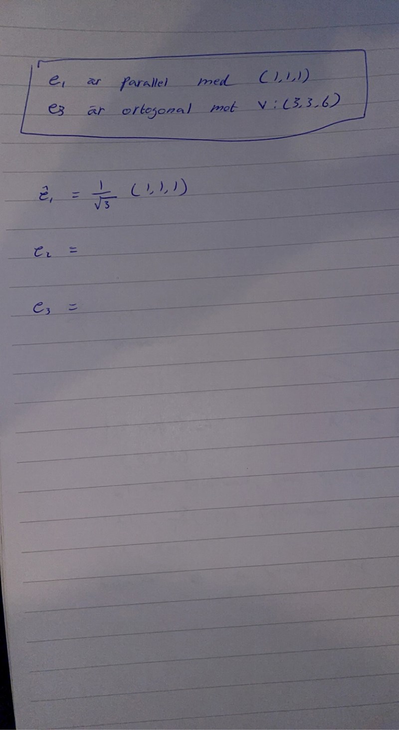Nej, inte riktigt. Du behöver börja med att hitta ‚ och det vi vet om den är att den är ortogonal mot vektorn . Med hjälp av en skalärprodukt kan du hitta dessa vektorer. Vilka vektorer uppfyller att ? :)