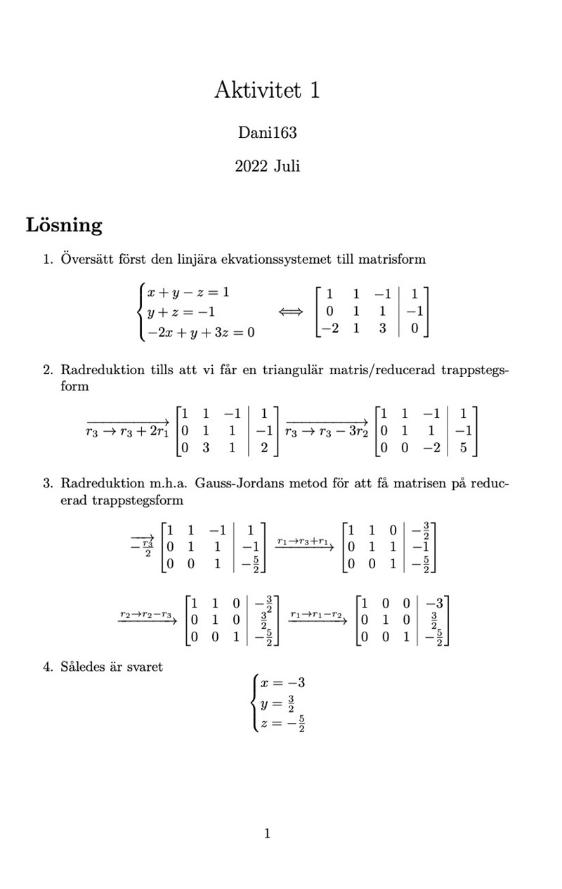 Jag håller med att TS har redovisat sina steg bra vilket är kul att se. Det är vanligt att vi bara får se matriserna utan att få veta vad som faktiskt sker i mellan. Jag är osäker varför läraren klagar på att det är för många steg och istället vill ha en skriflig förklaring. Jag tycker att i just detta fallet så talar matematiken för sig själv. Man ser ju vad som sker efter varje övergång till den "nya" matrisen. Tyvärr spelar det nog inte så stor roll då det i slutändan är läraren som bedömmer uppgiften och man blir tvungen att redovisa till deras tycke.
