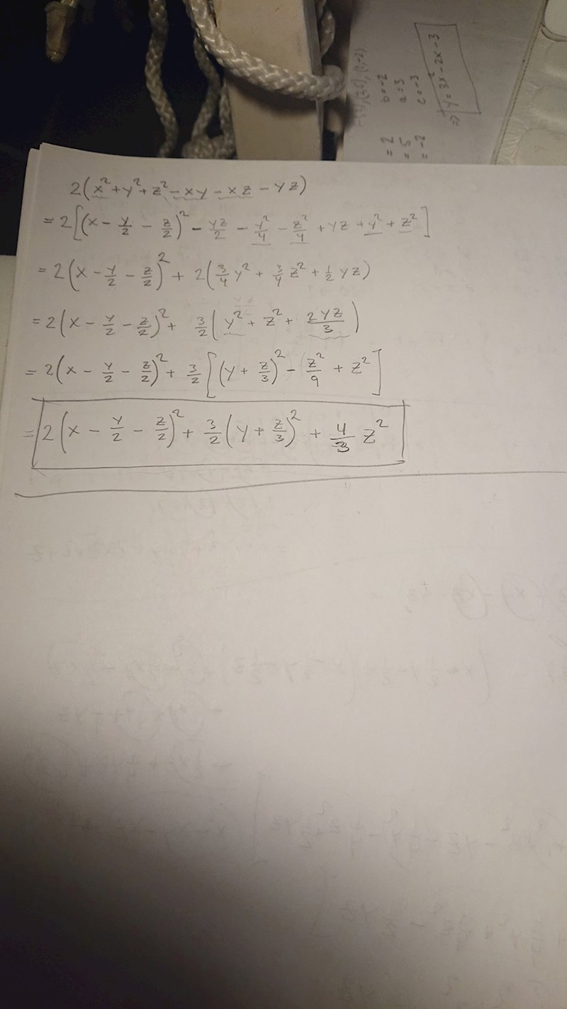 i min lärobok om linjär algebra(som är den rörigaste gojan jag läst) står det att man ska (steg 1) samla ihop alla termer som innehåller x först och bilda en kvadrat där alla dessa ingår och sedan (steg 2) fortsätta på samma sätt med y. Den andra kvadraten ska tydligen bestå enbart av y och z men samtidigt så finns det x-termer kvar efter jag har samlat alla dessa i steg 1. Behöver lite ledning på vägen.