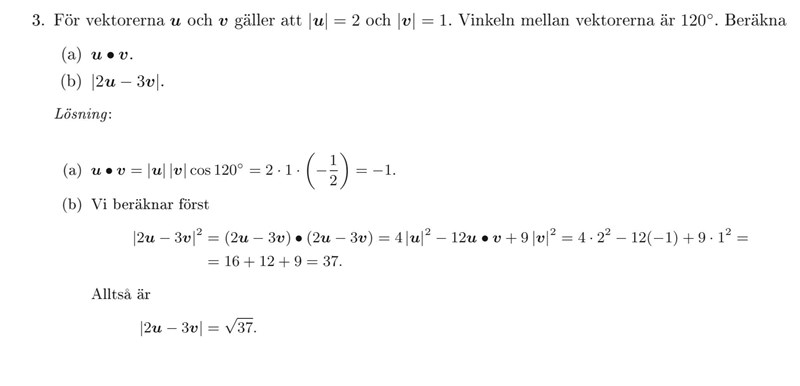 Uppgift a kunde jag lösa utan problem, sen förstår jag inte riktigt vad som sker i lösningsförslaget till uppgift b. Om man har en vektor t.ex så beräknar man längden av den vektorn genom att ta och skulle i detta fall fått . Varför tar man (2-3)(2-3)? Anser detta skalärprodukt eller vanlig multiplikation?