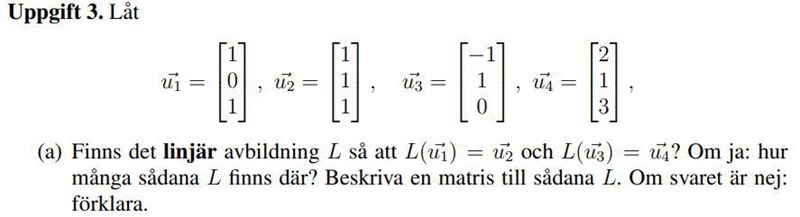 Ursprungligen ville jag ta hjälp av att kunna skriva linjärkombinationer till (1,0,0), (0,1,0), (0,0,1) för få fram en matris för A men insåg snabbt att jag inte kunde det och att jag inte ens vet vilka dimensioner matrisen A har, eftersom det inte gett något om det i uppgiften. Vilket får mig att luta åt att svaret är nej, men jag tycker formuleringen av uppgiften lutar åt att jag ska få fram att det finns en linjär avbildning, speciellt eftersom man ska använda sig av samma i del b).