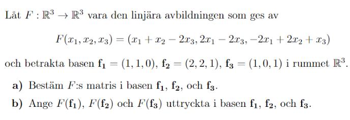Tänk dig nu att du har en vektor i basen f du vill avbilda och gör ett steg i taget. Först vill du översätta den till vanlig bas, sen vill du avbilda och sen byta tillbaka till f innan du svarar, eller hur?