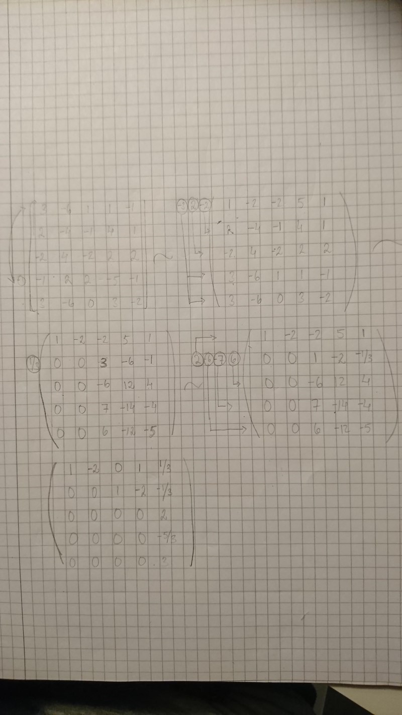 Okej, fortsätt med att dividera tredje raden med 2, sedan fortsätter du reducera på sista kolonnen.