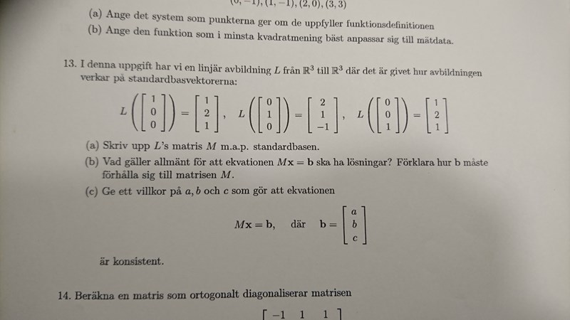 Ekvationen säger att vektorn ska kunna skrivas som en linjärkombination av dessa kolonner, med andra ord ska ligga i matrisens kolonnrum,