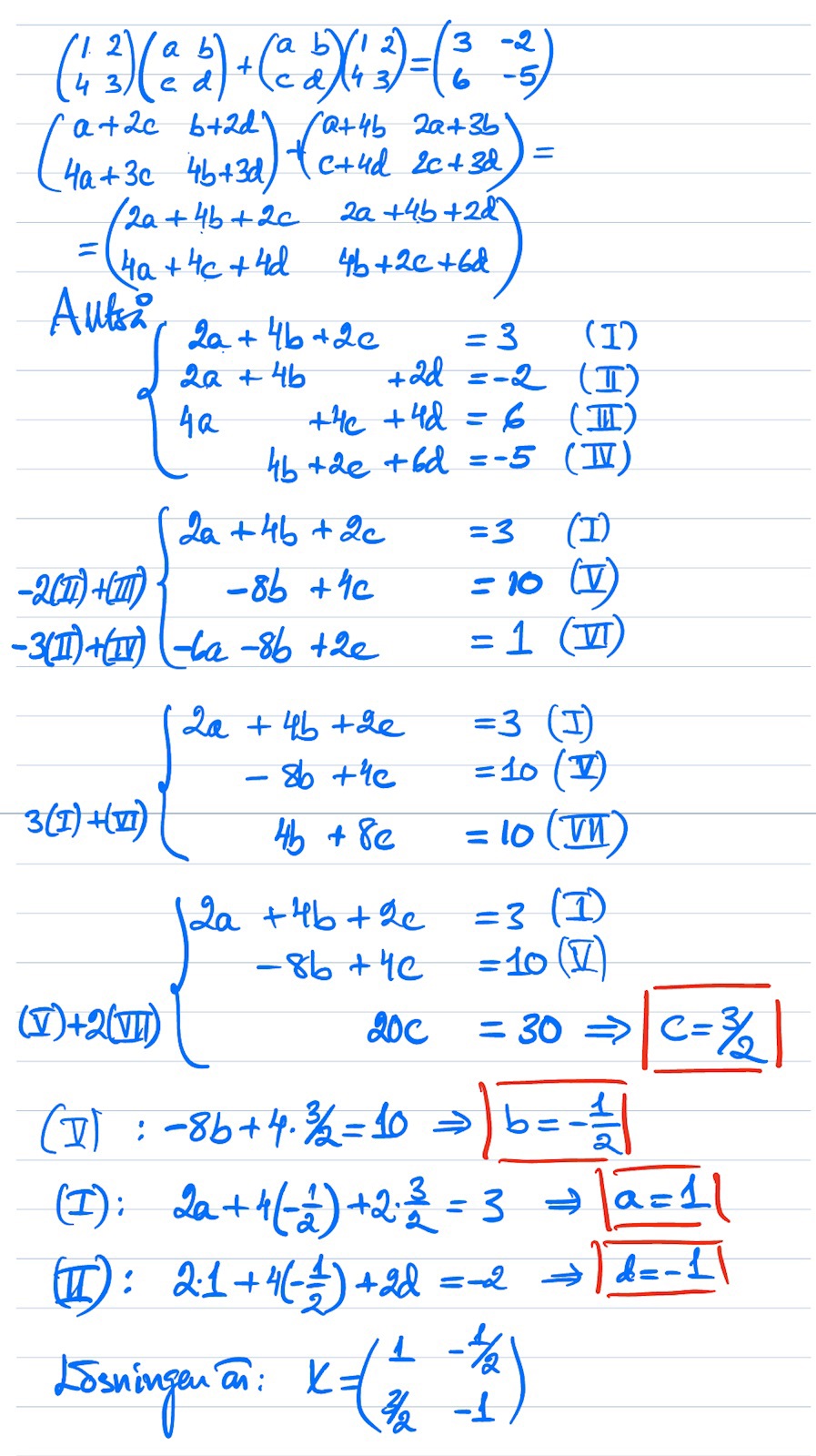 Då detta är mina egna beräkningar har jag gjort många steg samtidigt i beräkningen, fråga om ni är förvirrade av några av stegen. Men när jag multiplicerar en rad med en annan och gör radbyte så görs multiplikationen först och sedan radbytet.