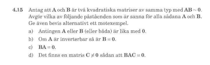 Matrismultiplikation bildar ett ekvationssystem, i detta fall av komponenter från A och B, där alla ekvationer skall vara lika med noll. Detta säger mig dock inte så mycket. Det låter ju logiskt att om alla ekvationer i det givna ekvationssystemet är troligtvis alla komponenter i ekvationen av värdet noll, men det behöver ju inte vara fallet. Alltså borde a) vara falsk, men svaret skall vara sant.