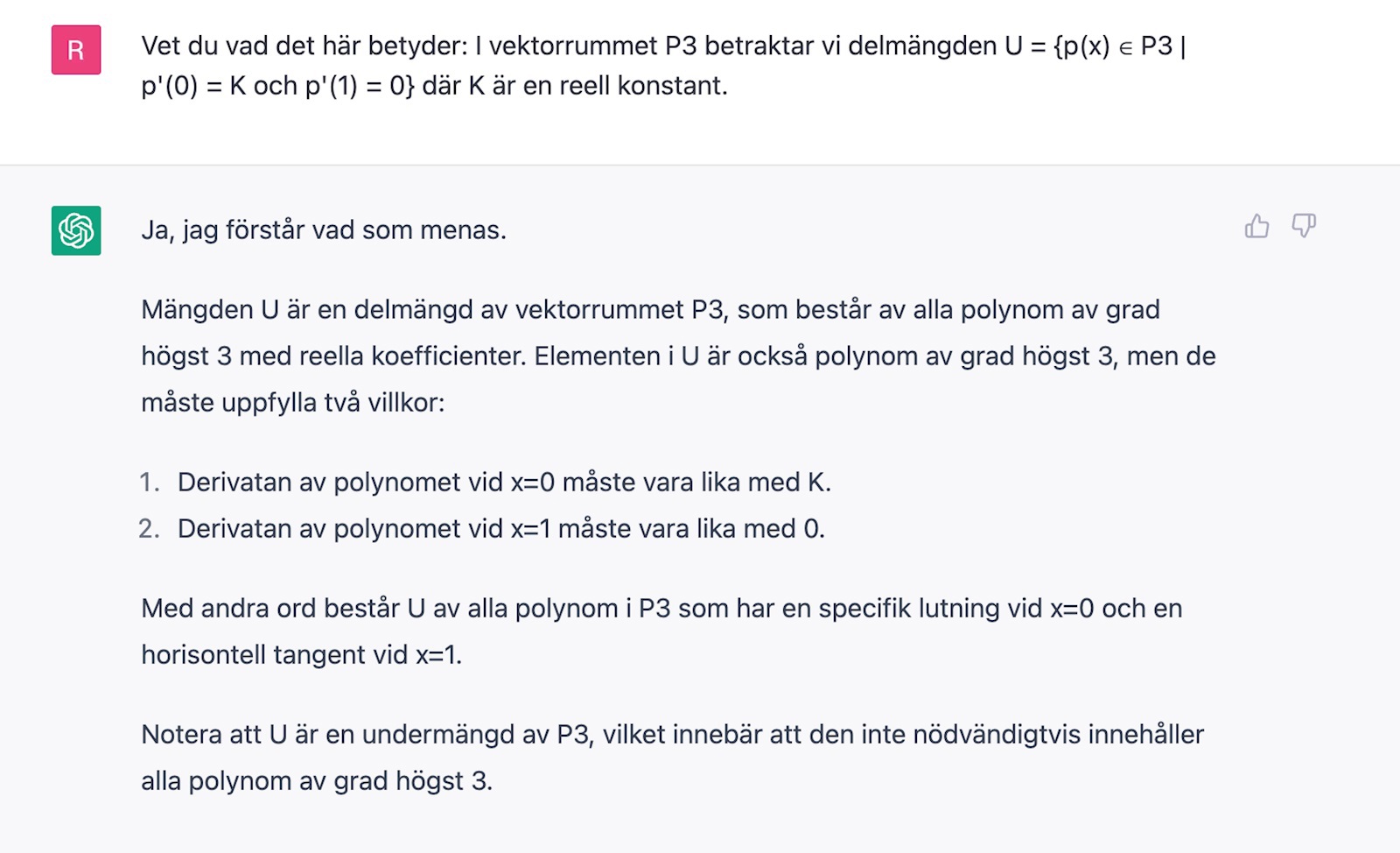 Halloj jag håller på att plugga till en tenta i linjär algerbra och undrar hur bra ide det är att ta hjälp av chat-GPT. Jag har t.ex. den här frågan: